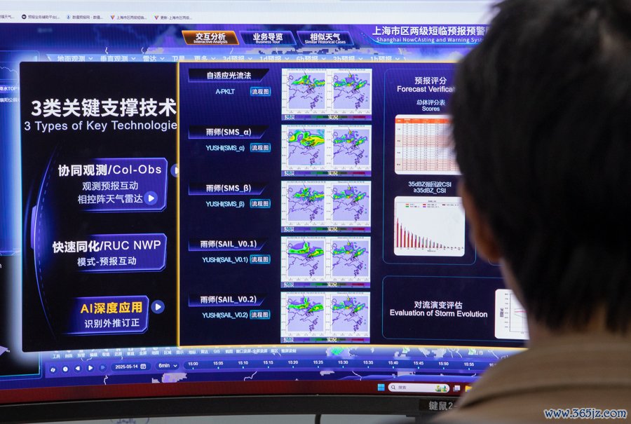 春夏交棒,上海夏意渐浓,今夜明晨雨水将随之现身,颇有些雨季欲来的意味。这几日,位于上海气象局气象大楼8楼的上海市人工智能气象应用创新中心十分忙碌,几盏办公灯时常亮到天黑,围坐在电脑前的一群年轻人的眼睛紧盯着屏幕上跳动着雷达回波图、卫星云图和数值预报模型的输出结果,键盘敲击声此起彼伏,混合着低语和争论——