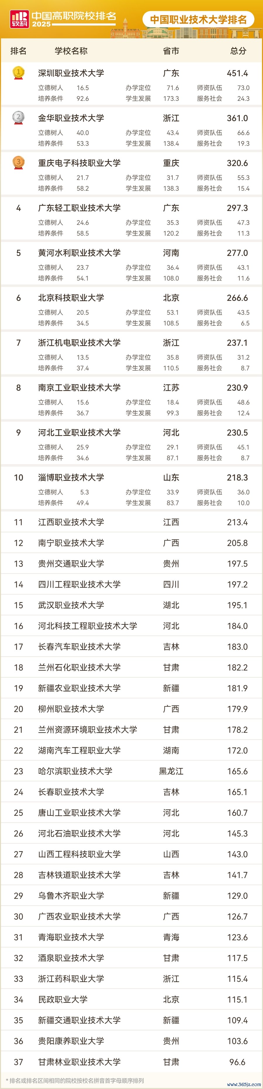 截至2025年3月,全国已有60所院校升格为本科层次的职业技术大学。此次,榜单设置了公办职业技术大学排名(“职本排名”)和民办职业技术大学排名(“民办职本排名”)2个子榜单;而对于高职专科院校,则细分为综合、理工、师范等9个类型的公办高职专科院校排名,以及1个民办高职专科院校排名。